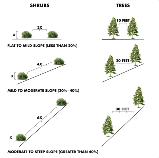 ● On a medium slope (20-40%), space trees at least 20 feet apart and shrubs 4x their height.