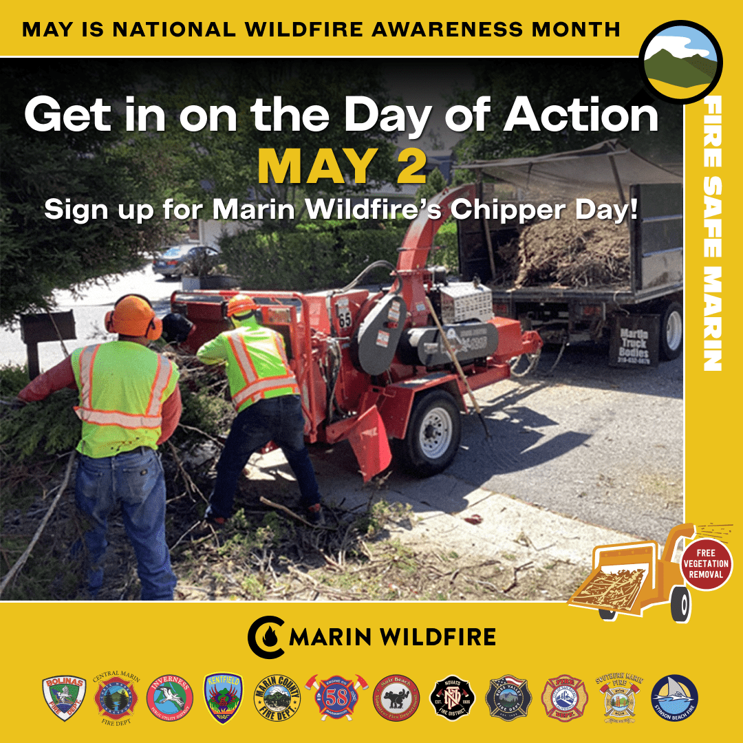 May 2 is also the National Fire Protection Agency’s National Wildfire Community Preparedness Day. Referred to as a Day of Action, this nationwide campaign is intended to empower people to be proactive with their wildfire safety efforts. For Marin, the focus will be on encouraging residents to sign up for Chipper Days, an annual offering from MWPA in which residents can dispose of vegetation debris. Chipper Days are a simple, practical step that helps reduce wildfire risk around the home by eliminating potential fire fuels. Promoting Chipper Day signups creates a direct connection between awareness and action by giving residents a clear way to prepare for fire season.