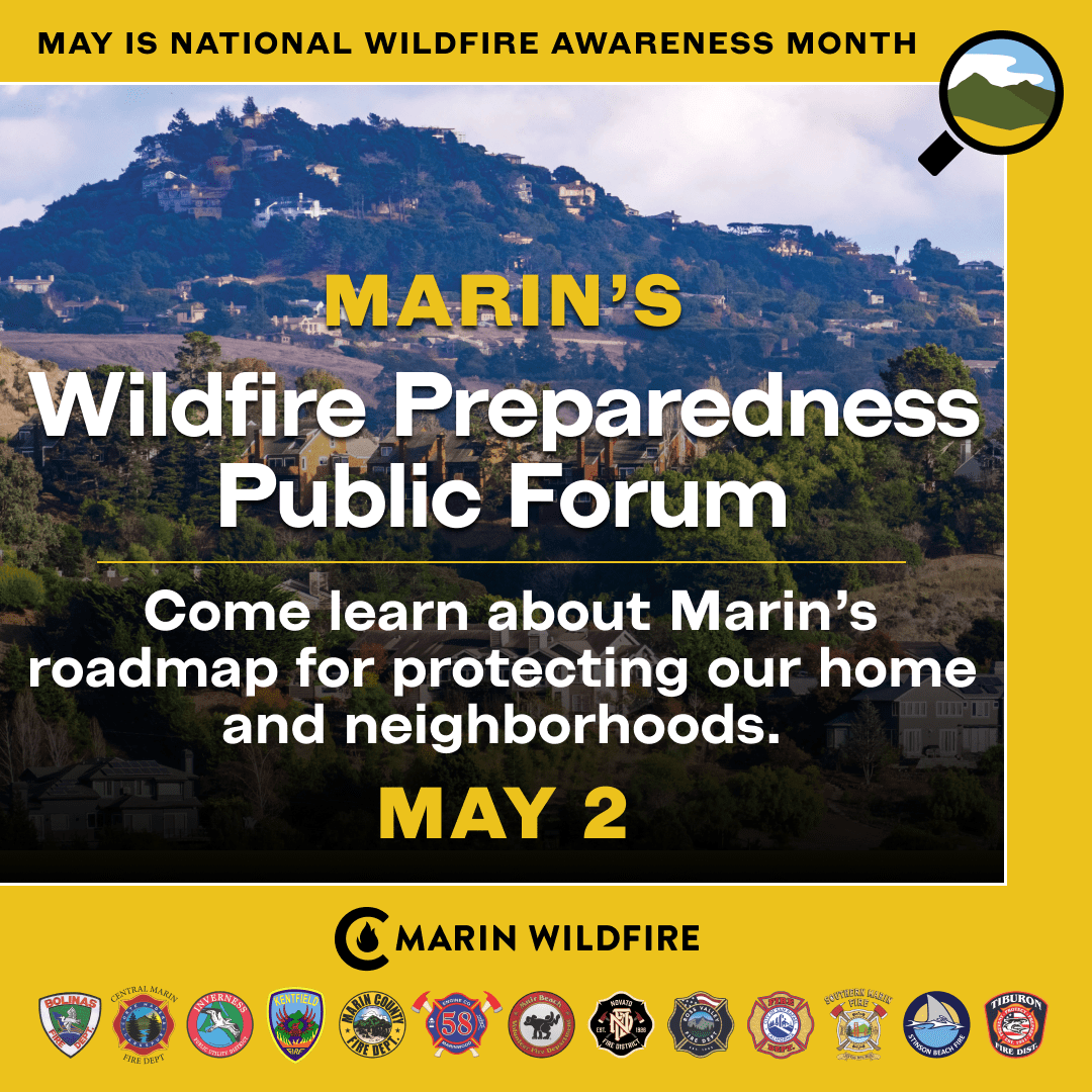 Marin Wildfire Prevention Authority (MWPA) will begin National Wildfire Awareness Month with Marin’s Wildfire Preparedness Public Forum on Saturday, May 2. The Forum will be held at Embassy Suites, 101 McInnis Parkway in San Rafael, from 9:30AM to 12PM. The event will bring residents, local fire agencies, and community partners together for a countywide conversation about wildfire risk, preparedness, and action.