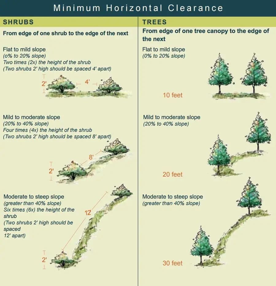 - On a steep slope (over 40%), space trees at least 30 feet apart and shrubs 6x their height.