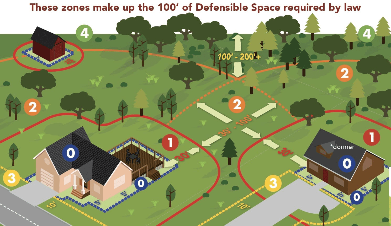 - Zone 4 is area shared with neighbors and/or land management agencies. 100-200+ ft.