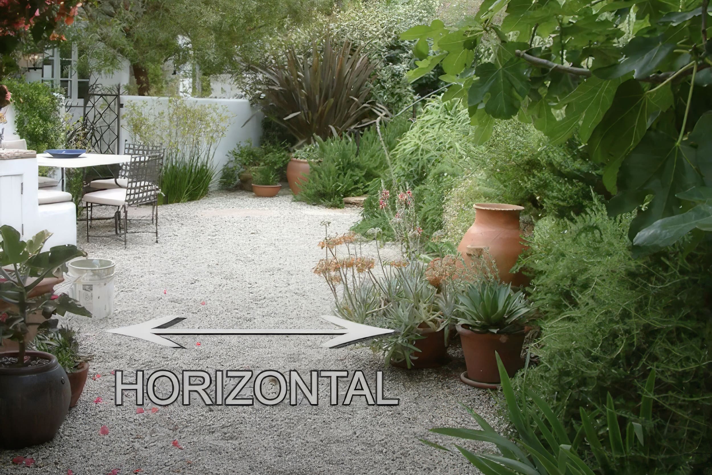The photo below shows the use of planters, various mulches, hardscape, and plant separation. These plants are well separated and several different methods are used to create horizontal spacing including stone steps, mulch, lawn and planter boxes.